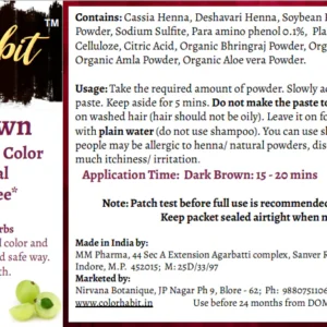 Usage: Take the required amount of powder. Slowly add warm water to make a paste. Keep aside for 5 mins. Do not make the paste too thick/thin. Apply the paste on washed hair (hair should not be oily). Leave it on for 20-30 minutes. Wash hair with plain water (do not use shampoo). You can use shampoo after 24 hours. Some people may be allergic to henna/ natural powders, discontinue use if there is too much itchiness/ irritation.